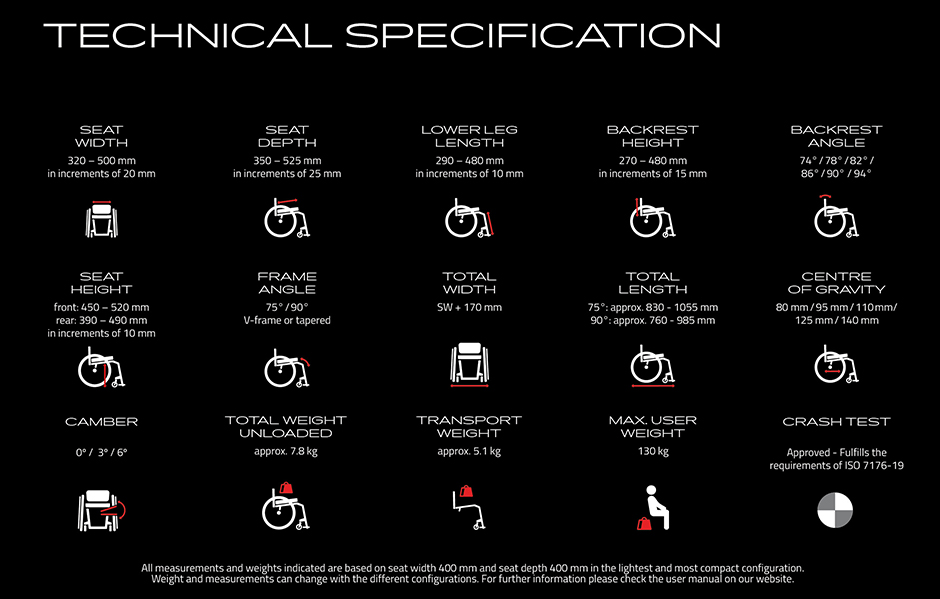 Precision even in the smallest details. The tapered frame allows the wheelchair to contour to your body for a sleek aesthetic. The footbow is completely redesigned with a flat surface for greater comfort, and perfect positioning. An ergonomic back brace for increased grip when lifting during transfers. Lower brace positioning, ideal for Matrx backrests. Folding backrest with six possible angle adjustments for different positioning needs. At the heart of the K-series the seat module offers five different centre of gravity positions, allowing a choice of high activity or increased stability within the wheelchair, as standard. New aluminium profile castor housing welded to the front frame tube. Consistent design throughout the entire wheelchair.